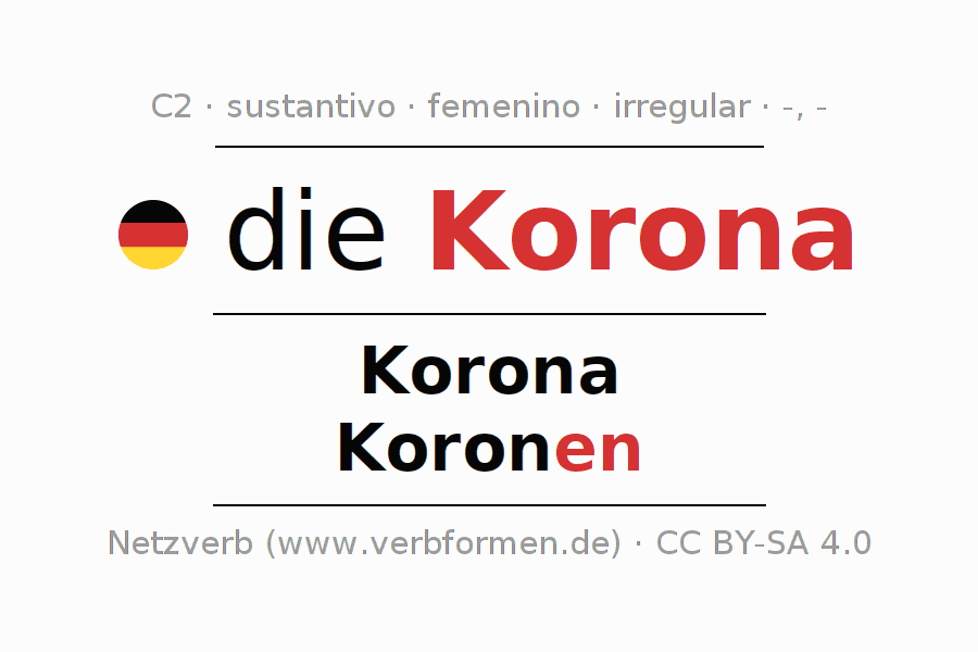 La declinación del sustantivo en forma de tabla con todas su formas: singular, plural y en los cuatro casos: nominativo (primer caso), genitivo (segundo caso), dativo (tercer caso) y acusativo (cuarto caso). Las construcciones gramaticales están representadas de forma clara en una tabla sinópica. La inflexión de los sustantivos es una ayuda durante tareas, exámenes, para cursos de alemán, la universidad, el estudio del alemán como lengua extranjera o como segundo idioma y para estudiantes adultos. La declinación correcta de las palabras es especialmente importante para los que aprenden el idioma alemán. Aquí encontraras más información acerca del tema Wiktionary Korona y aquí también a través del Duden Korona.