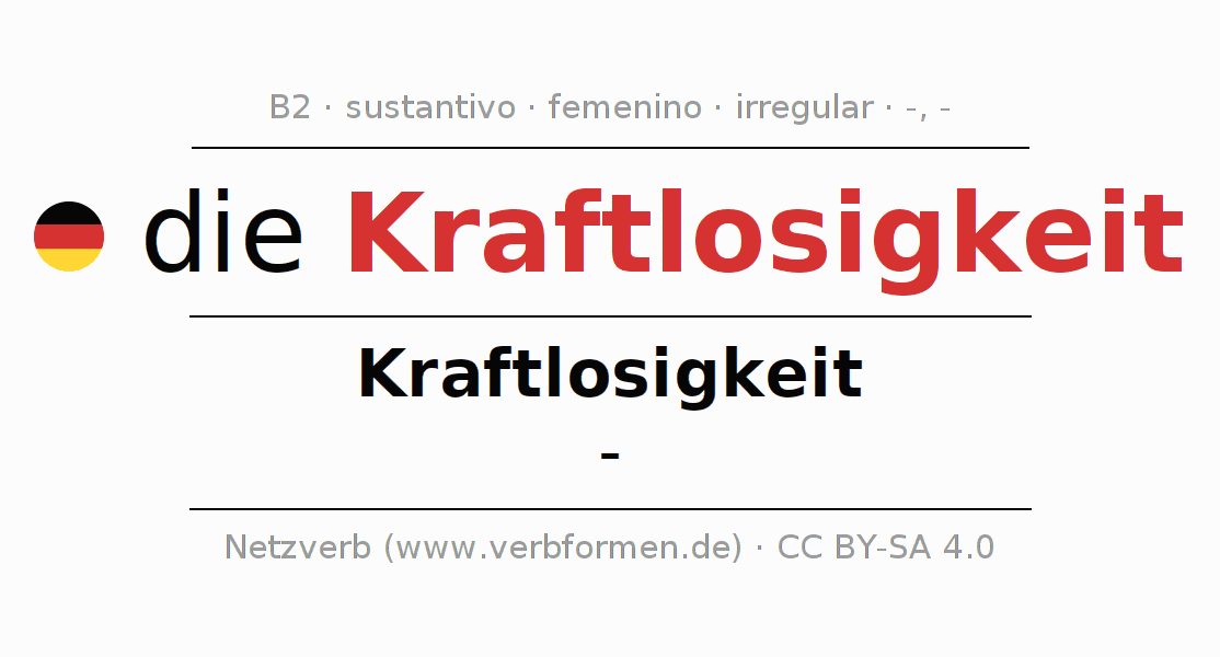 La declinación del sustantivo en forma de tabla con todas su formas: singular, plural y en los cuatro casos: nominativo (primer caso), genitivo (segundo caso), dativo (tercer caso) y acusativo (cuarto caso). Las construcciones gramaticales están representadas de forma clara en una tabla sinópica. La inflexión de los sustantivos es una ayuda durante tareas, exámenes, para cursos de alemán, la universidad, el estudio del alemán como lengua extranjera o como segundo idioma y para estudiantes adultos. La declinación correcta de las palabras es especialmente importante para los que aprenden el idioma alemán. Aquí encontraras más información acerca del tema Wiktionary Kraftlosigkeit y aquí también a través del Duden Kraftlosigkeit.