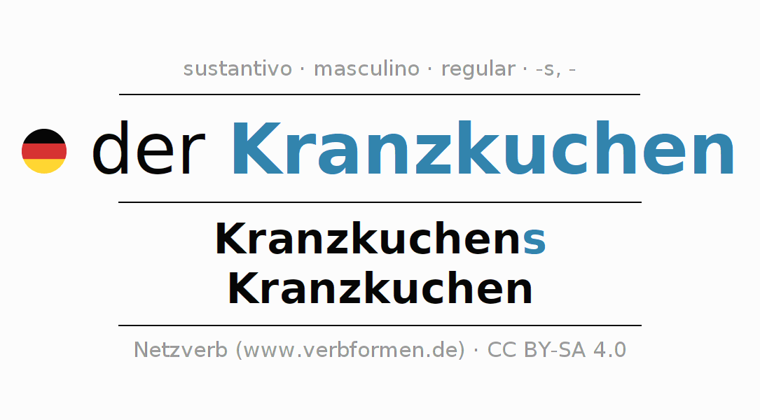 La declinación del sustantivo en forma de tabla con todas su formas: singular, plural y en los cuatro casos: nominativo (primer caso), genitivo (segundo caso), dativo (tercer caso) y acusativo (cuarto caso). Las construcciones gramaticales están representadas de forma clara en una tabla sinópica. La inflexión de los sustantivos es una ayuda durante tareas, exámenes, para cursos de alemán, la universidad, el estudio del alemán como lengua extranjera o como segundo idioma y para estudiantes adultos. La declinación correcta de las palabras es especialmente importante para los que aprenden el idioma alemán. Aquí encontraras más información acerca del tema Wiktionary Kranzkuchen y aquí también a través del Duden Kranzkuchen.