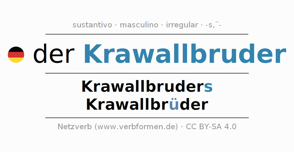 La declinación del sustantivo en forma de tabla con todas su formas: singular, plural y en los cuatro casos: nominativo (primer caso), genitivo (segundo caso), dativo (tercer caso) y acusativo (cuarto caso). Las construcciones gramaticales están representadas de forma clara en una tabla sinópica. La inflexión de los sustantivos es una ayuda durante tareas, exámenes, para cursos de alemán, la universidad, el estudio del alemán como lengua extranjera o como segundo idioma y para estudiantes adultos. La declinación correcta de las palabras es especialmente importante para los que aprenden el idioma alemán. Aquí encontraras más información acerca del tema Wiktionary Krawallbruder y aquí también a través del Duden Krawallbruder.