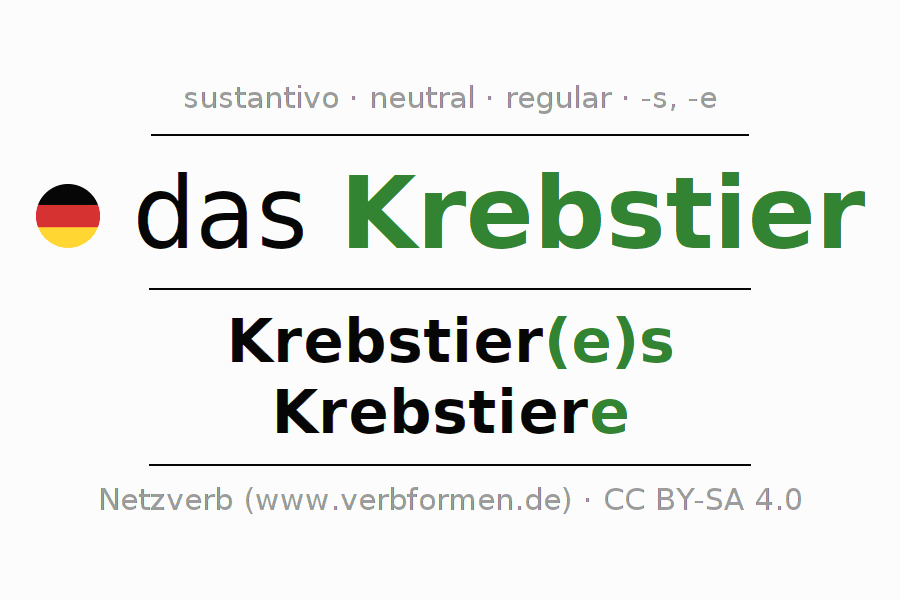 La declinación del sustantivo en forma de tabla con todas su formas: singular, plural y en los cuatro casos: nominativo (primer caso), genitivo (segundo caso), dativo (tercer caso) y acusativo (cuarto caso). Las construcciones gramaticales están representadas de forma clara en una tabla sinópica. La inflexión de los sustantivos es una ayuda durante tareas, exámenes, para cursos de alemán, la universidad, el estudio del alemán como lengua extranjera o como segundo idioma y para estudiantes adultos. La declinación correcta de las palabras es especialmente importante para los que aprenden el idioma alemán. Aquí encontraras más información acerca del tema Wiktionary Krebstier y aquí también a través del Duden Krebstier.