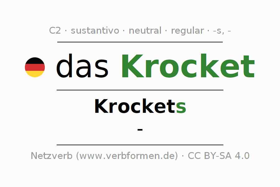 La declinación del sustantivoKrocket (croquet) se encuentra en genitivoKrockets del singular y en el nominativo- del plural. El sustantivo Krocket se conjuga de forma fuerte (irregular) con estas terminaciones s/-. No permite construcciones en plural. El género gramatical de Krocket es neutro y por eso se requiere el artículo definido ‘das’. Aquí puedes declinar no solamente Krocket sino también todos los sustantivos alemanes . Este sustantivo pertenece al vocabulario necesario para pasar el examen "Zertifikat Deutsch" o para el nivel C2. Comentarios ☆