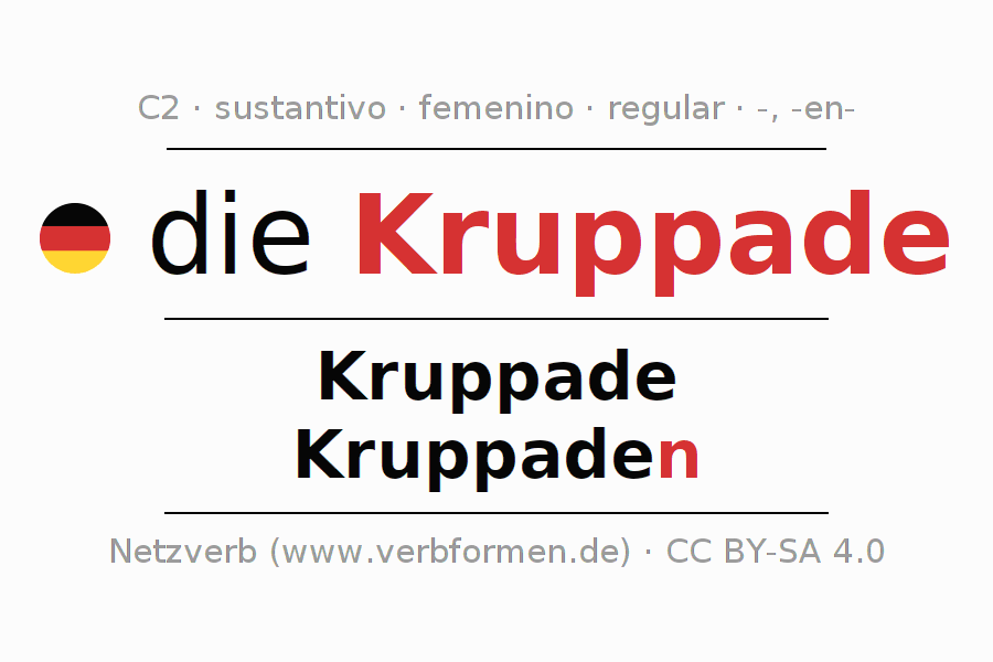 La declinación del sustantivo en forma de tabla con todas su formas: singular, plural y en los cuatro casos: nominativo (primer caso), genitivo (segundo caso), dativo (tercer caso) y acusativo (cuarto caso). Las construcciones gramaticales están representadas de forma clara en una tabla sinópica. La inflexión de los sustantivos es una ayuda durante tareas, exámenes, para cursos de alemán, la universidad, el estudio del alemán como lengua extranjera o como segundo idioma y para estudiantes adultos. La declinación correcta de las palabras es especialmente importante para los que aprenden el idioma alemán. Aquí encontraras más información acerca del tema Wiktionary Kruppade y aquí también a través del Duden Kruppade.