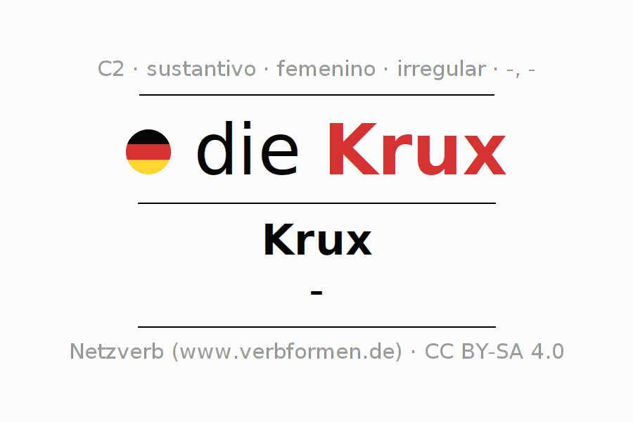 La declinación del sustantivoKrux (problema, contradicción) se encuentra en genitivoKrux del singular y en el nominativo- del plural. El sustantivo Krux se declina con las terminaciones -/-. No permite construcciones en plural. El género gramatical de Krux es femenino y por eso se requiere el artículo definido ‘die’. Aquí puedes declinar no solamente Krux sino también todos los sustantivos alemanes . Este sustantivo pertenece al vocabulario necesario para pasar el examen "Zertifikat Deutsch" o para el nivel C2. Comentarios ☆