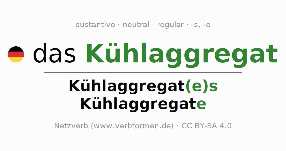 La declinación del sustantivo en forma de tabla con todas su formas: singular, plural y en los cuatro casos: nominativo (primer caso), genitivo (segundo caso), dativo (tercer caso) y acusativo (cuarto caso). Las construcciones gramaticales están representadas de forma clara en una tabla sinópica. La inflexión de los sustantivos es una ayuda durante tareas, exámenes, para cursos de alemán, la universidad, el estudio del alemán como lengua extranjera o como segundo idioma y para estudiantes adultos. La declinación correcta de las palabras es especialmente importante para los que aprenden el idioma alemán. Aquí encontraras más información acerca del tema Wiktionary Kühlaggregat y aquí también a través del Duden Kühlaggregat.