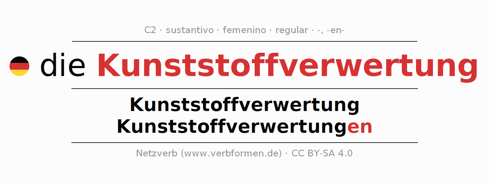 La declinación del sustantivo en forma de tabla con todas su formas: singular, plural y en los cuatro casos: nominativo (primer caso), genitivo (segundo caso), dativo (tercer caso) y acusativo (cuarto caso). Las construcciones gramaticales están representadas de forma clara en una tabla sinópica. La inflexión de los sustantivos es una ayuda durante tareas, exámenes, para cursos de alemán, la universidad, el estudio del alemán como lengua extranjera o como segundo idioma y para estudiantes adultos. La declinación correcta de las palabras es especialmente importante para los que aprenden el idioma alemán. Aquí encontraras más información acerca del tema Wiktionary Kunststoffverwertung y aquí también a través del Duden Kunststoffverwertung.