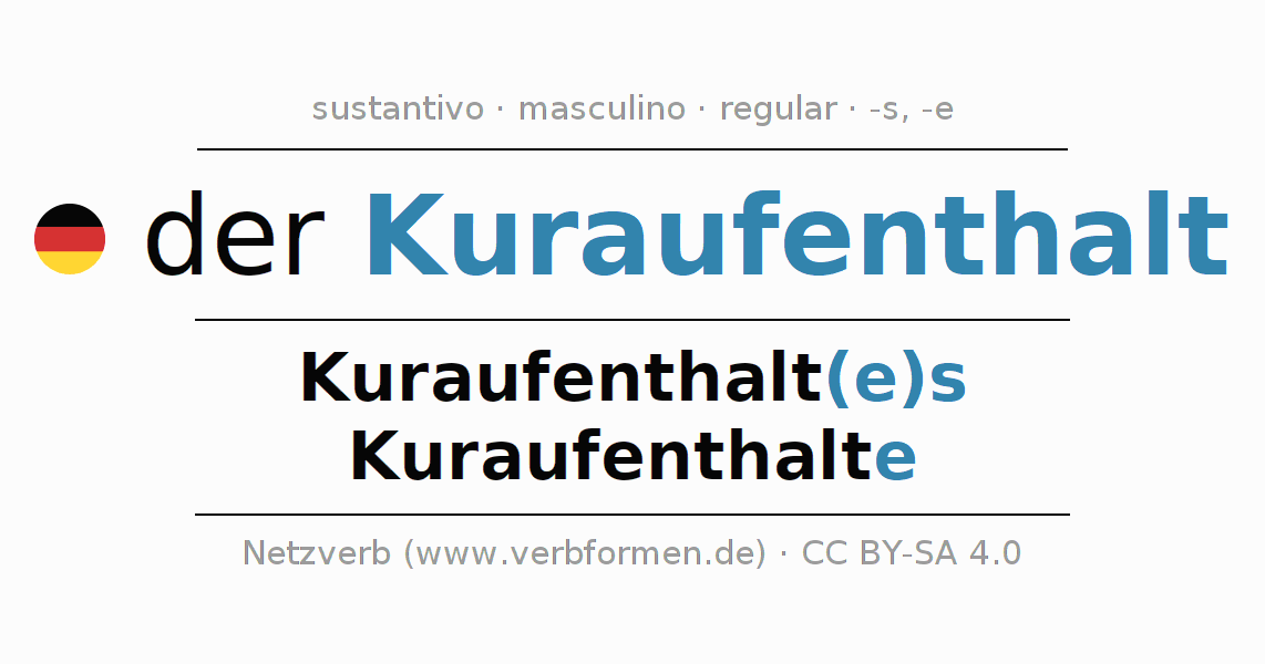 La declinación del sustantivoKuraufenthalt (cura, estancia terapéutica) se encuentra en genitivoKuraufenthalt(e)s del singular y en el nominativoKuraufenthalte del plural. El sustantivo Kuraufenthalt se conjuga de forma fuerte (irregular) con estas terminaciones es/e. El género gramatical de Kuraufenthalt es masculino y por eso se requiere el artículo definido ‘der’. Aquí puedes declinar no solamente Kuraufenthalt sino también todos los sustantivos alemanes . Comentarios ☆