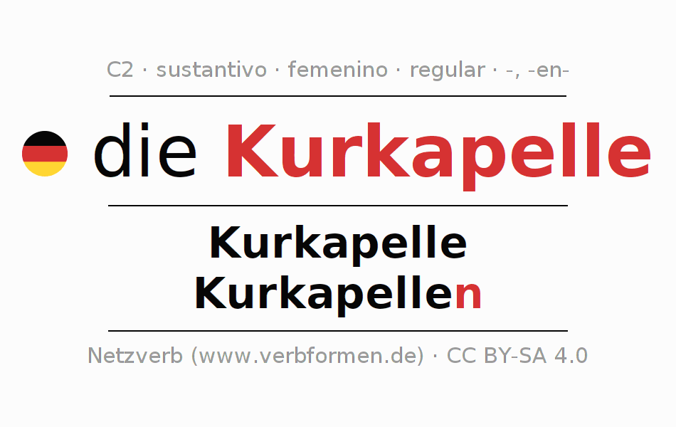 La declinación del sustantivo en forma de tabla con todas su formas: singular, plural y en los cuatro casos: nominativo (primer caso), genitivo (segundo caso), dativo (tercer caso) y acusativo (cuarto caso). Las construcciones gramaticales están representadas de forma clara en una tabla sinópica. La inflexión de los sustantivos es una ayuda durante tareas, exámenes, para cursos de alemán, la universidad, el estudio del alemán como lengua extranjera o como segundo idioma y para estudiantes adultos. La declinación correcta de las palabras es especialmente importante para los que aprenden el idioma alemán. Aquí encontraras más información acerca del tema Wiktionary Kurkapelle y aquí también a través del Duden Kurkapelle.