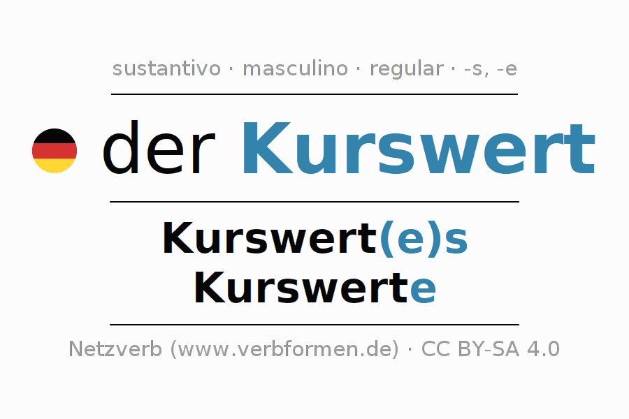 La declinación del sustantivo en forma de tabla con todas su formas: singular, plural y en los cuatro casos: nominativo (primer caso), genitivo (segundo caso), dativo (tercer caso) y acusativo (cuarto caso). Las construcciones gramaticales están representadas de forma clara en una tabla sinópica. La inflexión de los sustantivos es una ayuda durante tareas, exámenes, para cursos de alemán, la universidad, el estudio del alemán como lengua extranjera o como segundo idioma y para estudiantes adultos. La declinación correcta de las palabras es especialmente importante para los que aprenden el idioma alemán. Aquí encontraras más información acerca del tema Wiktionary Kurswert y aquí también a través del Duden Kurswert.