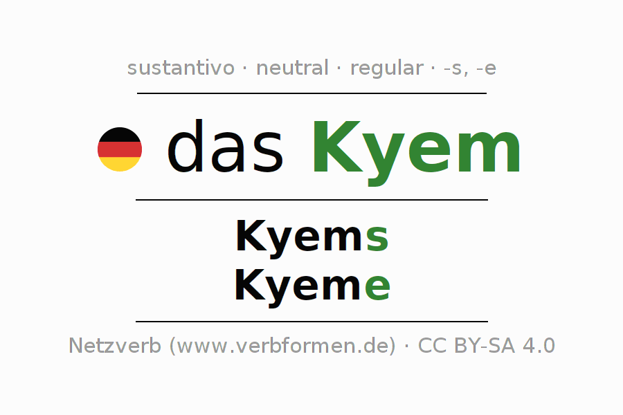 La declinación del sustantivoKyem se encuentra en genitivoKyems del singular y en el nominativoKyeme del plural. El sustantivo Kyem se conjuga de forma fuerte (irregular) con estas terminaciones s/e. El género gramatical de Kyem es neutro y por eso se requiere el artículo definido ‘das’. Aquí puedes declinar no solamente Kyem sino también todos los sustantivos alemanes . Comentarios ☆