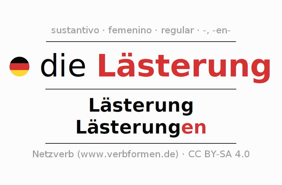 La declinación del sustantivo en forma de tabla con todas su formas: singular, plural y en los cuatro casos: nominativo (primer caso), genitivo (segundo caso), dativo (tercer caso) y acusativo (cuarto caso). Las construcciones gramaticales están representadas de forma clara en una tabla sinópica. La inflexión de los sustantivos es una ayuda durante tareas, exámenes, para cursos de alemán, la universidad, el estudio del alemán como lengua extranjera o como segundo idioma y para estudiantes adultos. La declinación correcta de las palabras es especialmente importante para los que aprenden el idioma alemán. Aquí encontraras más información acerca del tema Wiktionary Lästerung y aquí también a través del Duden Lästerung.