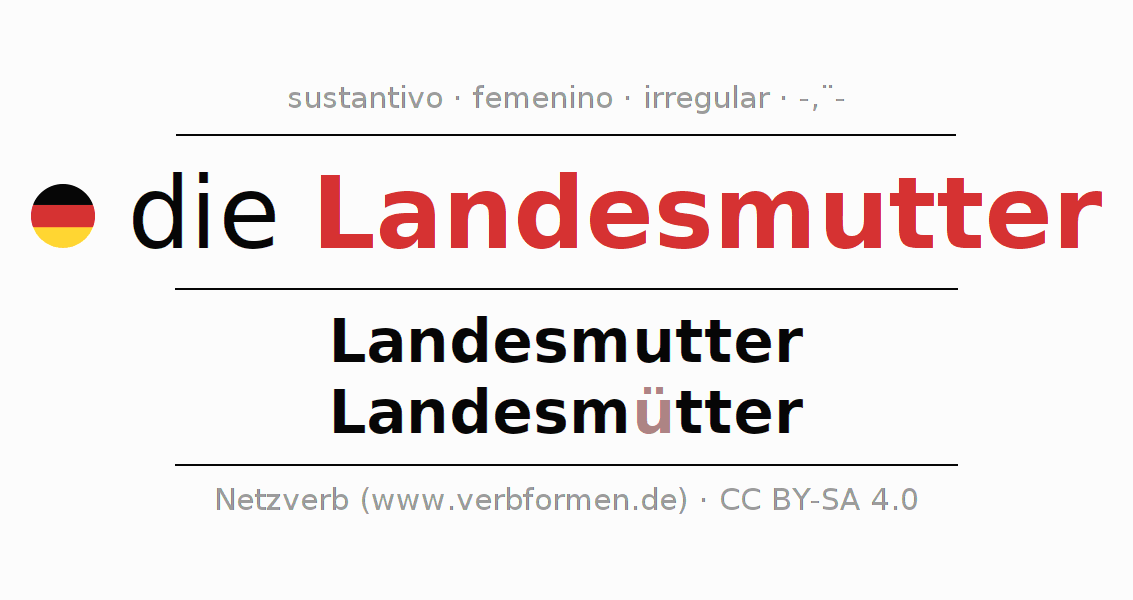 La declinación del sustantivo en forma de tabla con todas su formas: singular, plural y en los cuatro casos: nominativo (primer caso), genitivo (segundo caso), dativo (tercer caso) y acusativo (cuarto caso). Las construcciones gramaticales están representadas de forma clara en una tabla sinópica. La inflexión de los sustantivos es una ayuda durante tareas, exámenes, para cursos de alemán, la universidad, el estudio del alemán como lengua extranjera o como segundo idioma y para estudiantes adultos. La declinación correcta de las palabras es especialmente importante para los que aprenden el idioma alemán. Aquí encontraras más información acerca del tema Wiktionary Landesmutter y aquí también a través del Duden Landesmutter.