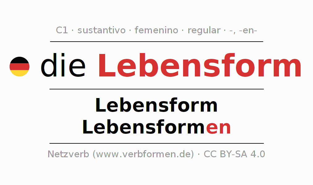 La declinación del sustantivo en forma de tabla con todas su formas: singular, plural y en los cuatro casos: nominativo (primer caso), genitivo (segundo caso), dativo (tercer caso) y acusativo (cuarto caso). Las construcciones gramaticales están representadas de forma clara en una tabla sinópica. La inflexión de los sustantivos es una ayuda durante tareas, exámenes, para cursos de alemán, la universidad, el estudio del alemán como lengua extranjera o como segundo idioma y para estudiantes adultos. La declinación correcta de las palabras es especialmente importante para los que aprenden el idioma alemán. Aquí encontraras más información acerca del tema Wiktionary Lebensform y aquí también a través del Duden Lebensform.