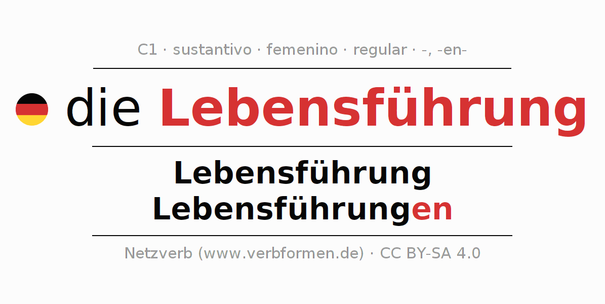La declinación del sustantivo en forma de tabla con todas su formas: singular, plural y en los cuatro casos: nominativo (primer caso), genitivo (segundo caso), dativo (tercer caso) y acusativo (cuarto caso). Las construcciones gramaticales están representadas de forma clara en una tabla sinópica. La inflexión de los sustantivos es una ayuda durante tareas, exámenes, para cursos de alemán, la universidad, el estudio del alemán como lengua extranjera o como segundo idioma y para estudiantes adultos. La declinación correcta de las palabras es especialmente importante para los que aprenden el idioma alemán. Aquí encontraras más información acerca del tema Wiktionary Lebensführung y aquí también a través del Duden Lebensführung.