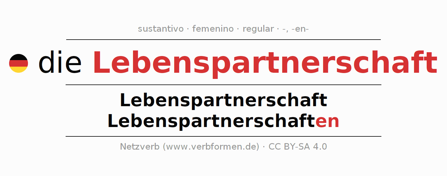 La declinación del sustantivo en forma de tabla con todas su formas: singular, plural y en los cuatro casos: nominativo (primer caso), genitivo (segundo caso), dativo (tercer caso) y acusativo (cuarto caso). Las construcciones gramaticales están representadas de forma clara en una tabla sinópica. La inflexión de los sustantivos es una ayuda durante tareas, exámenes, para cursos de alemán, la universidad, el estudio del alemán como lengua extranjera o como segundo idioma y para estudiantes adultos. La declinación correcta de las palabras es especialmente importante para los que aprenden el idioma alemán. Aquí encontraras más información acerca del tema Wiktionary Lebenspartnerschaft y aquí también a través del Duden Lebenspartnerschaft.