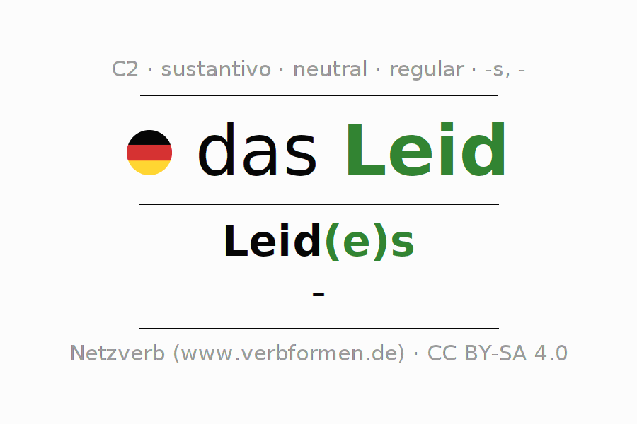 La declinación del sustantivo en forma de tabla con todas su formas: singular, plural y en los cuatro casos: nominativo (primer caso), genitivo (segundo caso), dativo (tercer caso) y acusativo (cuarto caso). Las construcciones gramaticales están representadas de forma clara en una tabla sinópica. La inflexión de los sustantivos es una ayuda durante tareas, exámenes, para cursos de alemán, la universidad, el estudio del alemán como lengua extranjera o como segundo idioma y para estudiantes adultos. La declinación correcta de las palabras es especialmente importante para los que aprenden el idioma alemán. Aquí encontraras más información acerca del tema Wiktionary Leid y aquí también a través del Duden Leid.