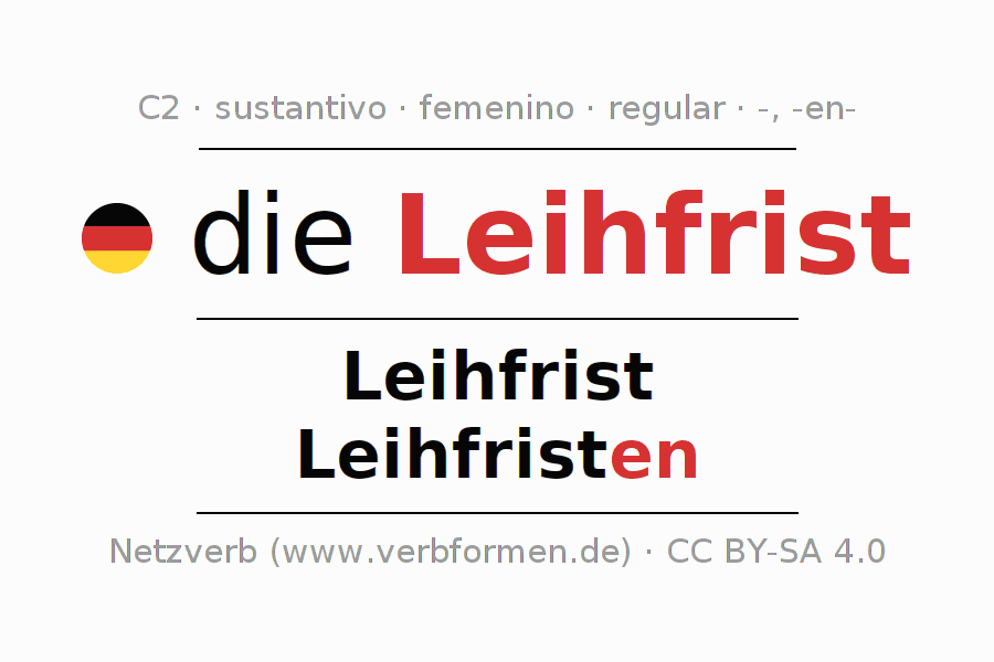 La declinación del sustantivo en forma de tabla con todas su formas: singular, plural y en los cuatro casos: nominativo (primer caso), genitivo (segundo caso), dativo (tercer caso) y acusativo (cuarto caso). Las construcciones gramaticales están representadas de forma clara en una tabla sinópica. La inflexión de los sustantivos es una ayuda durante tareas, exámenes, para cursos de alemán, la universidad, el estudio del alemán como lengua extranjera o como segundo idioma y para estudiantes adultos. La declinación correcta de las palabras es especialmente importante para los que aprenden el idioma alemán. Aquí encontraras más información acerca del tema Wiktionary Leihfrist y aquí también a través del Duden Leihfrist.
