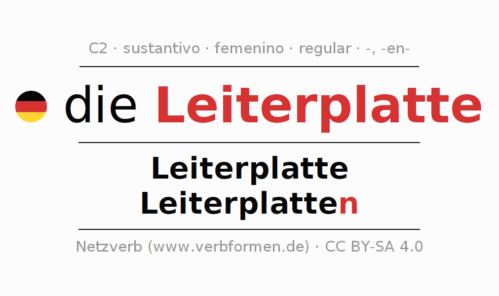 La declinación del sustantivoLeiterplatte (placa de circuito) se encuentra en genitivoLeiterplatte del singular y en el nominativoLeiterplatten del plural. El sustantivo Leiterplatte se declina de forma débil con las terminaciones -/n. El género gramatical de Leiterplatte es femenino y por eso se requiere el artículo definido ‘die’. Aquí puedes declinar no solamente Leiterplatte sino también todos los sustantivos alemanes . Este sustantivo pertenece al vocabulario necesario para pasar el examen "Zertifikat Deutsch" o para el nivel C2. Comentarios ☆