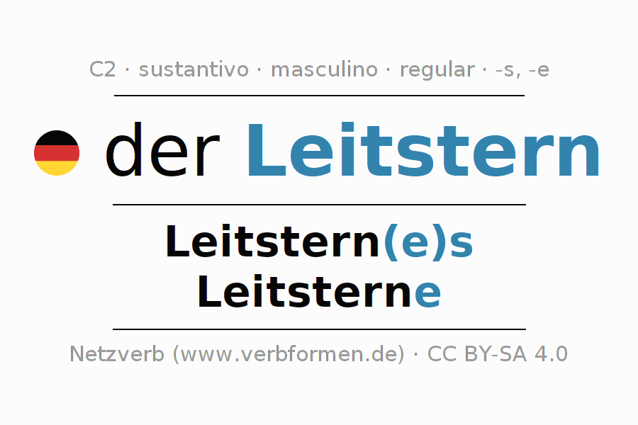 La declinación del sustantivoLeitstern (estrella guía) se encuentra en genitivoLeitstern(e)s del singular y en el nominativoLeitsterne del plural. El sustantivo Leitstern se conjuga de forma fuerte (irregular) con estas terminaciones es/s/e. El género gramatical de Leitstern es masculino y por eso se requiere el artículo definido ‘der’. Aquí puedes declinar no solamente Leitstern sino también todos los sustantivos alemanes . Este sustantivo pertenece al vocabulario necesario para pasar el examen "Zertifikat Deutsch" o para el nivel C2. Comentarios ☆