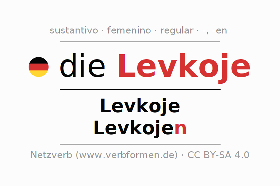 La declinación del sustantivo en forma de tabla con todas su formas: singular, plural y en los cuatro casos: nominativo (primer caso), genitivo (segundo caso), dativo (tercer caso) y acusativo (cuarto caso). Las construcciones gramaticales están representadas de forma clara en una tabla sinópica. La inflexión de los sustantivos es una ayuda durante tareas, exámenes, para cursos de alemán, la universidad, el estudio del alemán como lengua extranjera o como segundo idioma y para estudiantes adultos. La declinación correcta de las palabras es especialmente importante para los que aprenden el idioma alemán. Aquí encontraras más información acerca del tema Wiktionary Levkoje y aquí también a través del Duden Levkoje.