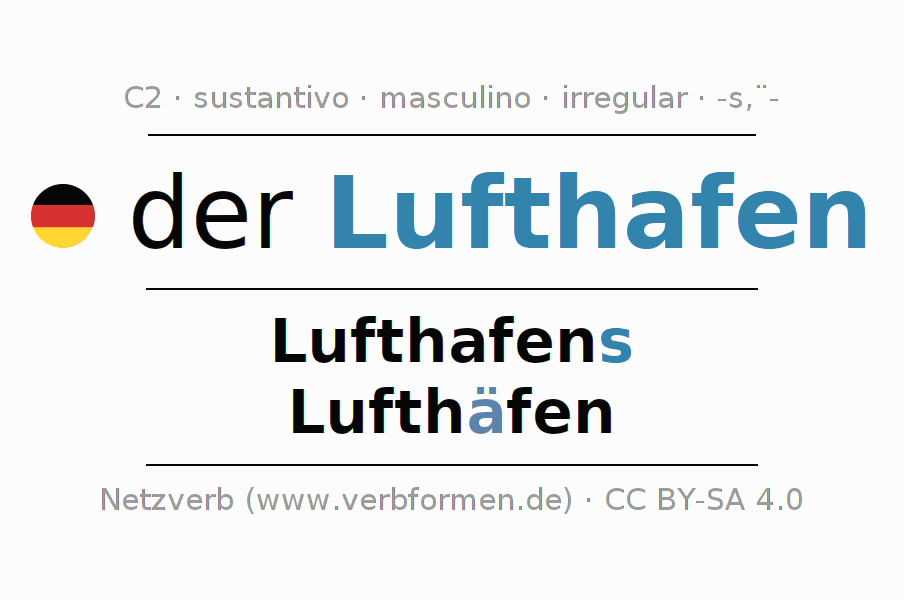 La declinación del sustantivo en forma de tabla con todas su formas: singular, plural y en los cuatro casos: nominativo (primer caso), genitivo (segundo caso), dativo (tercer caso) y acusativo (cuarto caso). Las construcciones gramaticales están representadas de forma clara en una tabla sinópica. La inflexión de los sustantivos es una ayuda durante tareas, exámenes, para cursos de alemán, la universidad, el estudio del alemán como lengua extranjera o como segundo idioma y para estudiantes adultos. La declinación correcta de las palabras es especialmente importante para los que aprenden el idioma alemán. Aquí encontraras más información acerca del tema Wiktionary Lufthafen y aquí también a través del Duden Lufthafen.