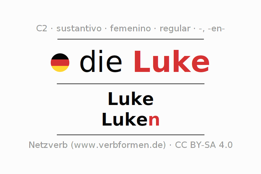 La declinación del sustantivoLuke (abertura, escotilla) se encuentra en genitivoLuke del singular y en el nominativoLuken del plural. El sustantivo Luke se declina de forma débil con las terminaciones -/n. El género gramatical de Luke es femenino y por eso se requiere el artículo definido ‘die’. Aquí puedes declinar no solamente Luke sino también todos los sustantivos alemanes . Este sustantivo pertenece al vocabulario necesario para pasar el examen "Zertifikat Deutsch" o para el nivel C2. Comentarios ☆
