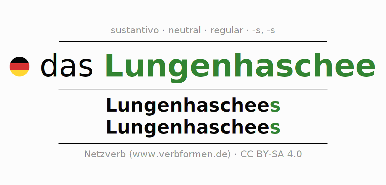 La declinación del sustantivo en forma de tabla con todas su formas: singular, plural y en los cuatro casos: nominativo (primer caso), genitivo (segundo caso), dativo (tercer caso) y acusativo (cuarto caso). Las construcciones gramaticales están representadas de forma clara en una tabla sinópica. La inflexión de los sustantivos es una ayuda durante tareas, exámenes, para cursos de alemán, la universidad, el estudio del alemán como lengua extranjera o como segundo idioma y para estudiantes adultos. La declinación correcta de las palabras es especialmente importante para los que aprenden el idioma alemán. Aquí encontraras más información acerca del tema Wiktionary Lungenhaschee y aquí también a través del Duden Lungenhaschee.
