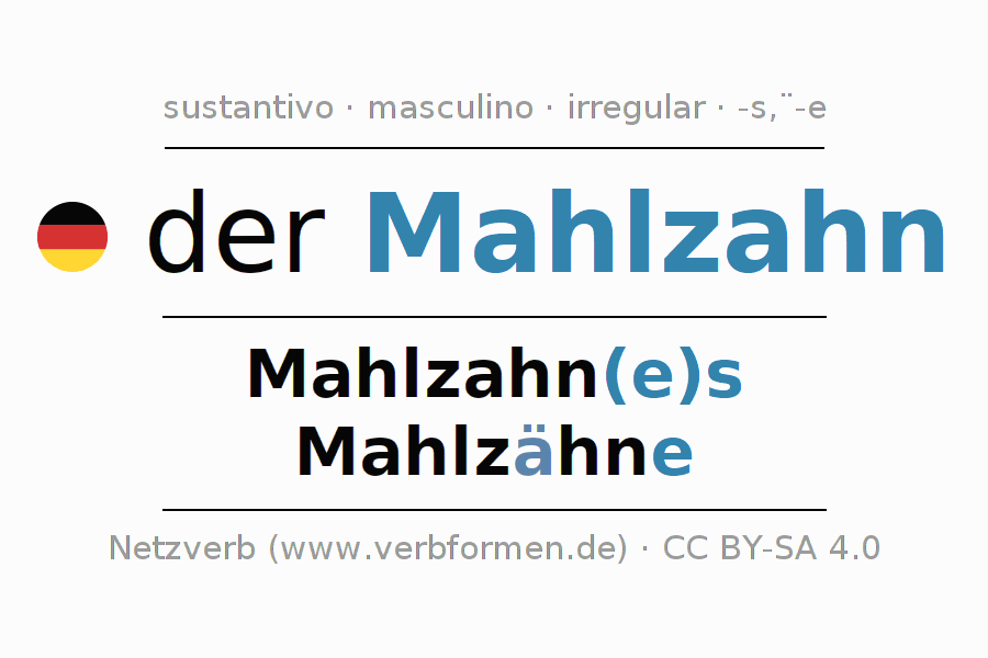 La declinación del sustantivo en forma de tabla con todas su formas: singular, plural y en los cuatro casos: nominativo (primer caso), genitivo (segundo caso), dativo (tercer caso) y acusativo (cuarto caso). Las construcciones gramaticales están representadas de forma clara en una tabla sinópica. La inflexión de los sustantivos es una ayuda durante tareas, exámenes, para cursos de alemán, la universidad, el estudio del alemán como lengua extranjera o como segundo idioma y para estudiantes adultos. La declinación correcta de las palabras es especialmente importante para los que aprenden el idioma alemán. Aquí encontraras más información acerca del tema Wiktionary Mahlzahn y aquí también a través del Duden Mahlzahn.