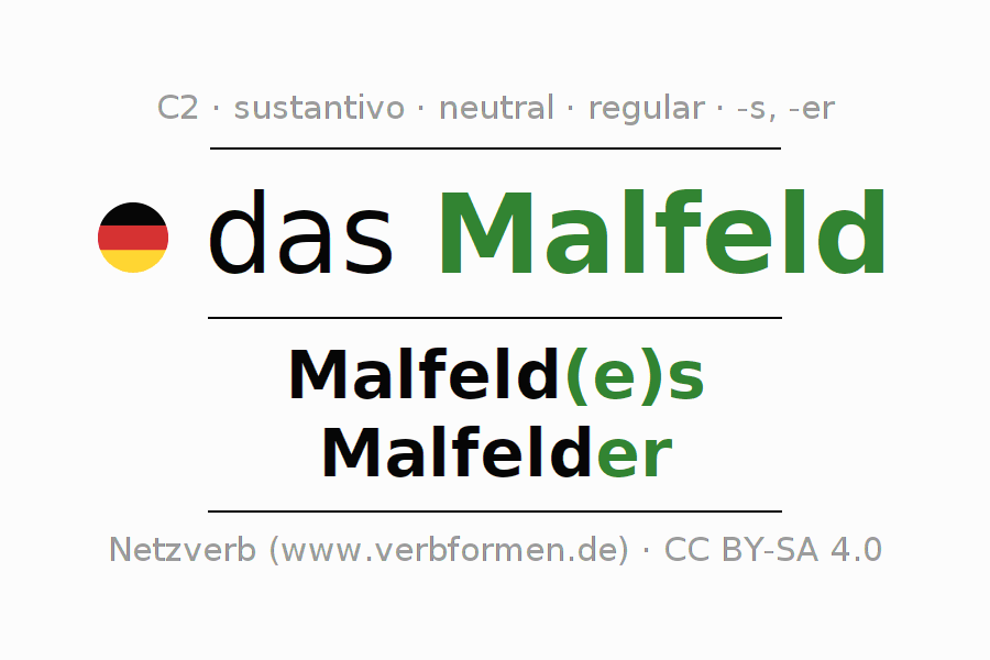 La declinación del sustantivoMalfeld (zona de puntuación) se encuentra en genitivoMalfeld(e)s del singular y en el nominativoMalfelder del plural. El sustantivo Malfeld se conjuga de forma fuerte (irregular) con estas terminaciones es/er. El género gramatical de Malfeld es neutro y por eso se requiere el artículo definido ‘das’. Aquí puedes declinar no solamente Malfeld sino también todos los sustantivos alemanes . Este sustantivo pertenece al vocabulario necesario para pasar el examen "Zertifikat Deutsch" o para el nivel C2. Comentarios ☆