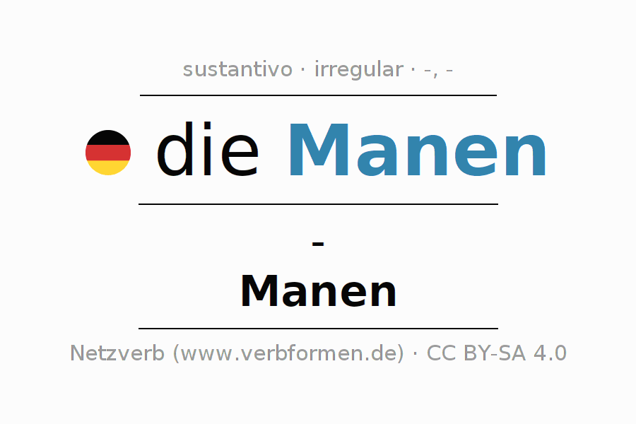 La declinación del sustantivoManen (manes) se encuentra en genitivo- del singular y en el nominativoManen del plural. El sustantivo Manen se declina con las terminaciones /-. No existe en forma singular. Pero el sustantivo puede ser utilizado también con otros géneros y otros artículos. Aquí puedes declinar no solamente Manen sino también todos los sustantivos alemanes . Comentarios ☆
