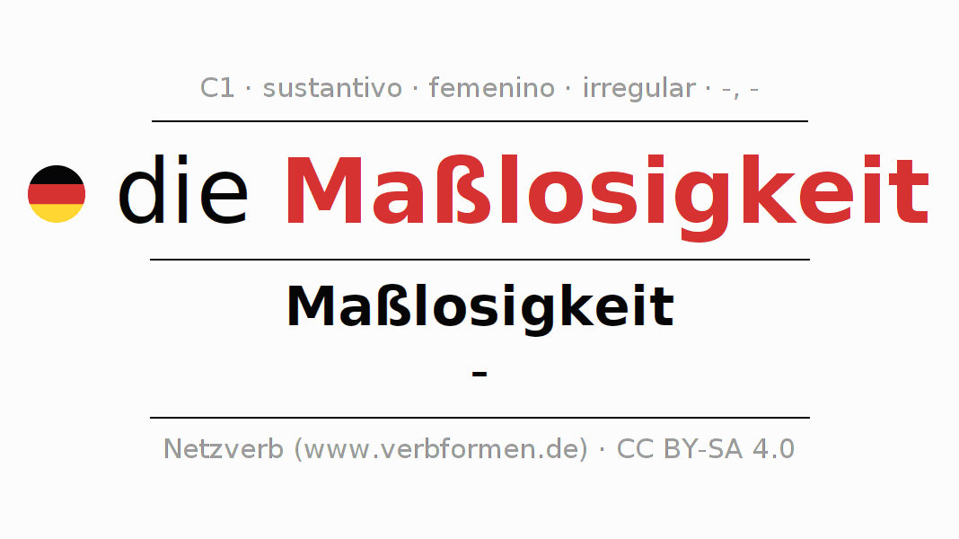 La declinación del sustantivo en forma de tabla con todas su formas: singular, plural y en los cuatro casos: nominativo (primer caso), genitivo (segundo caso), dativo (tercer caso) y acusativo (cuarto caso). Las construcciones gramaticales están representadas de forma clara en una tabla sinópica. La inflexión de los sustantivos es una ayuda durante tareas, exámenes, para cursos de alemán, la universidad, el estudio del alemán como lengua extranjera o como segundo idioma y para estudiantes adultos. La declinación correcta de las palabras es especialmente importante para los que aprenden el idioma alemán. Aquí encontraras más información acerca del tema Wiktionary Maßlosigkeit y aquí también a través del Duden Maßlosigkeit.