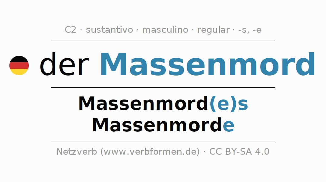 La declinación del sustantivo en forma de tabla con todas su formas: singular, plural y en los cuatro casos: nominativo (primer caso), genitivo (segundo caso), dativo (tercer caso) y acusativo (cuarto caso). Las construcciones gramaticales están representadas de forma clara en una tabla sinópica. La inflexión de los sustantivos es una ayuda durante tareas, exámenes, para cursos de alemán, la universidad, el estudio del alemán como lengua extranjera o como segundo idioma y para estudiantes adultos. La declinación correcta de las palabras es especialmente importante para los que aprenden el idioma alemán. Aquí encontraras más información acerca del tema Wiktionary Massenmord y aquí también a través del Duden Massenmord.
