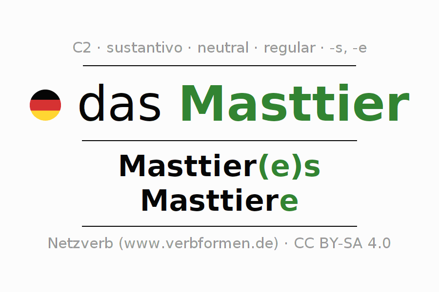La declinación del sustantivo en forma de tabla con todas su formas: singular, plural y en los cuatro casos: nominativo (primer caso), genitivo (segundo caso), dativo (tercer caso) y acusativo (cuarto caso). Las construcciones gramaticales están representadas de forma clara en una tabla sinópica. La inflexión de los sustantivos es una ayuda durante tareas, exámenes, para cursos de alemán, la universidad, el estudio del alemán como lengua extranjera o como segundo idioma y para estudiantes adultos. La declinación correcta de las palabras es especialmente importante para los que aprenden el idioma alemán. Aquí encontraras más información acerca del tema Wiktionary Masttier y aquí también a través del Duden Masttier.