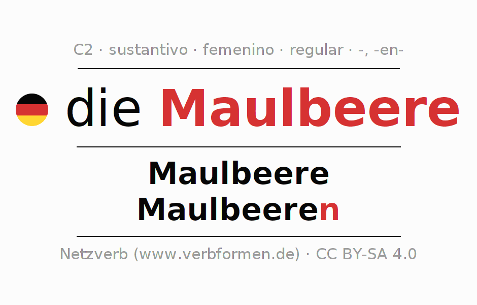 La declinación del sustantivo en forma de tabla con todas su formas: singular, plural y en los cuatro casos: nominativo (primer caso), genitivo (segundo caso), dativo (tercer caso) y acusativo (cuarto caso). Las construcciones gramaticales están representadas de forma clara en una tabla sinópica. La inflexión de los sustantivos es una ayuda durante tareas, exámenes, para cursos de alemán, la universidad, el estudio del alemán como lengua extranjera o como segundo idioma y para estudiantes adultos. La declinación correcta de las palabras es especialmente importante para los que aprenden el idioma alemán. Aquí encontraras más información acerca del tema Wiktionary Maulbeere y aquí también a través del Duden Maulbeere.