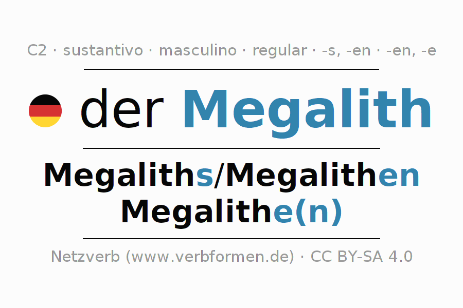 La declinación del sustantivo en forma de tabla con todas su formas: singular, plural y en los cuatro casos: nominativo (primer caso), genitivo (segundo caso), dativo (tercer caso) y acusativo (cuarto caso). Las construcciones gramaticales están representadas de forma clara en una tabla sinópica. La inflexión de los sustantivos es una ayuda durante tareas, exámenes, para cursos de alemán, la universidad, el estudio del alemán como lengua extranjera o como segundo idioma y para estudiantes adultos. La declinación correcta de las palabras es especialmente importante para los que aprenden el idioma alemán. Aquí encontraras más información acerca del tema Wiktionary Megalith y aquí también a través del Duden Megalith.