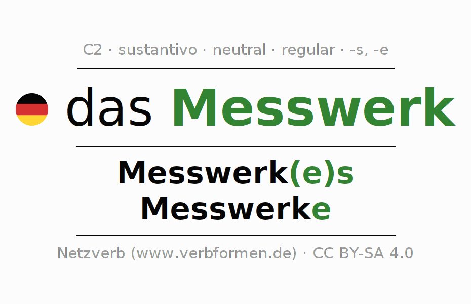 La declinación del sustantivo en forma de tabla con todas su formas: singular, plural y en los cuatro casos: nominativo (primer caso), genitivo (segundo caso), dativo (tercer caso) y acusativo (cuarto caso). Las construcciones gramaticales están representadas de forma clara en una tabla sinópica. La inflexión de los sustantivos es una ayuda durante tareas, exámenes, para cursos de alemán, la universidad, el estudio del alemán como lengua extranjera o como segundo idioma y para estudiantes adultos. La declinación correcta de las palabras es especialmente importante para los que aprenden el idioma alemán. Aquí encontraras más información acerca del tema Wiktionary Messwerk y aquí también a través del Duden Messwerk.