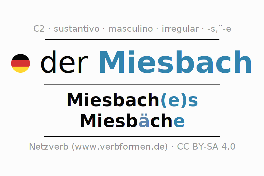 La declinación del sustantivoMiesbach se encuentra en genitivoMiesbach(e)s del singular y en el nominativoMiesbäche del plural. El sustantivo Miesbach se conjuga de forma fuerte (irregular) con estas terminaciones es/ä-e. El plural requiere el uso de diéresis. El género gramatical de Miesbach es masculino y por eso se requiere el artículo definido ‘der’. Aquí puedes declinar no solamente Miesbach sino también todos los sustantivos alemanes . Este sustantivo pertenece al vocabulario necesario para pasar el examen "Zertifikat Deutsch" o para el nivel C2. Comentarios ☆