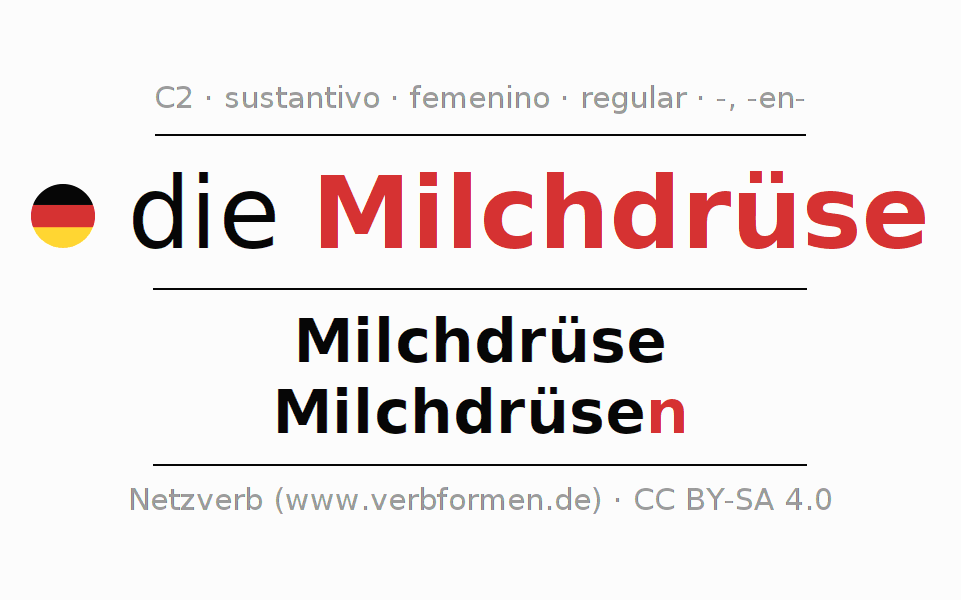 La declinación del sustantivo en forma de tabla con todas su formas: singular, plural y en los cuatro casos: nominativo (primer caso), genitivo (segundo caso), dativo (tercer caso) y acusativo (cuarto caso). Las construcciones gramaticales están representadas de forma clara en una tabla sinópica. La inflexión de los sustantivos es una ayuda durante tareas, exámenes, para cursos de alemán, la universidad, el estudio del alemán como lengua extranjera o como segundo idioma y para estudiantes adultos. La declinación correcta de las palabras es especialmente importante para los que aprenden el idioma alemán. Aquí encontraras más información acerca del tema Wiktionary Milchdrüse y aquí también a través del Duden Milchdrüse.