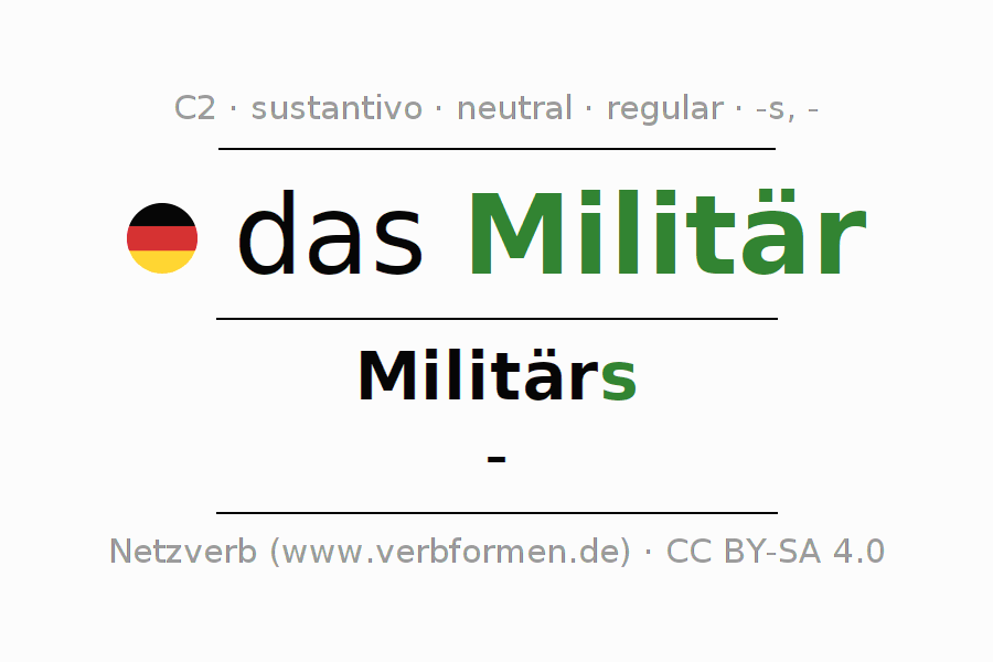 La declinación del sustantivo en forma de tabla con todas su formas: singular, plural y en los cuatro casos: nominativo (primer caso), genitivo (segundo caso), dativo (tercer caso) y acusativo (cuarto caso). Las construcciones gramaticales están representadas de forma clara en una tabla sinópica. La inflexión de los sustantivos es una ayuda durante tareas, exámenes, para cursos de alemán, la universidad, el estudio del alemán como lengua extranjera o como segundo idioma y para estudiantes adultos. La declinación correcta de las palabras es especialmente importante para los que aprenden el idioma alemán. Aquí encontraras más información acerca del tema Wiktionary das Militär y aquí también a través del Duden das Militär.