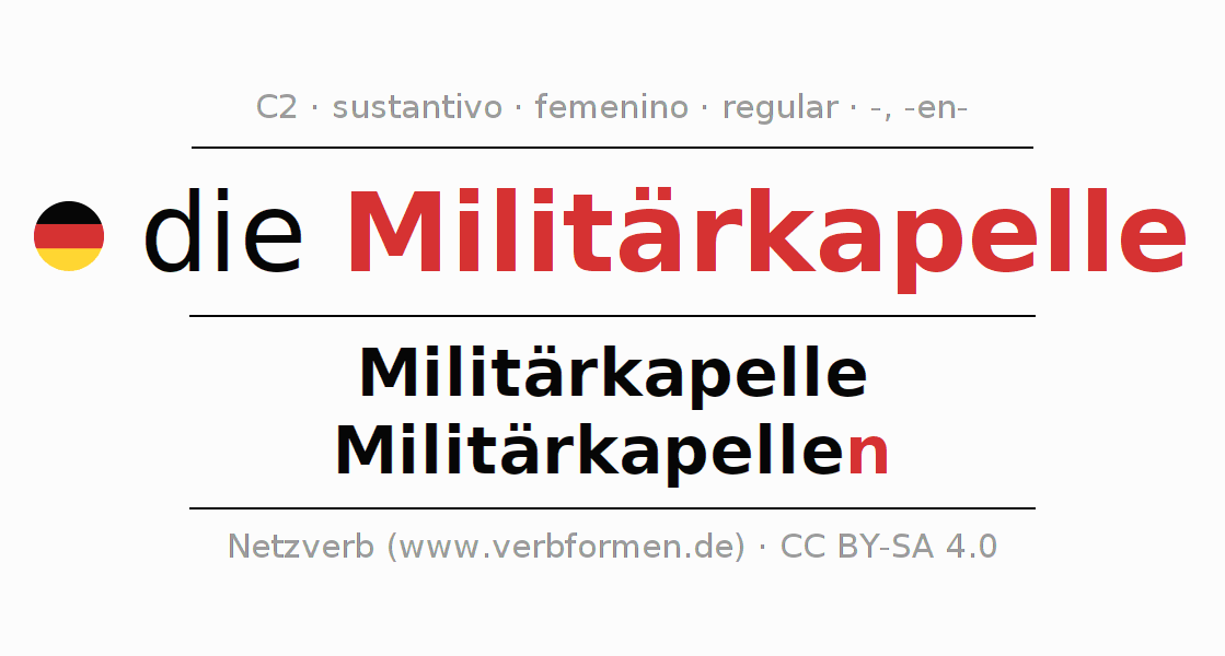 La declinación del sustantivo en forma de tabla con todas su formas: singular, plural y en los cuatro casos: nominativo (primer caso), genitivo (segundo caso), dativo (tercer caso) y acusativo (cuarto caso). Las construcciones gramaticales están representadas de forma clara en una tabla sinópica. La inflexión de los sustantivos es una ayuda durante tareas, exámenes, para cursos de alemán, la universidad, el estudio del alemán como lengua extranjera o como segundo idioma y para estudiantes adultos. La declinación correcta de las palabras es especialmente importante para los que aprenden el idioma alemán. Aquí encontraras más información acerca del tema Wiktionary Militärkapelle y aquí también a través del Duden Militärkapelle.