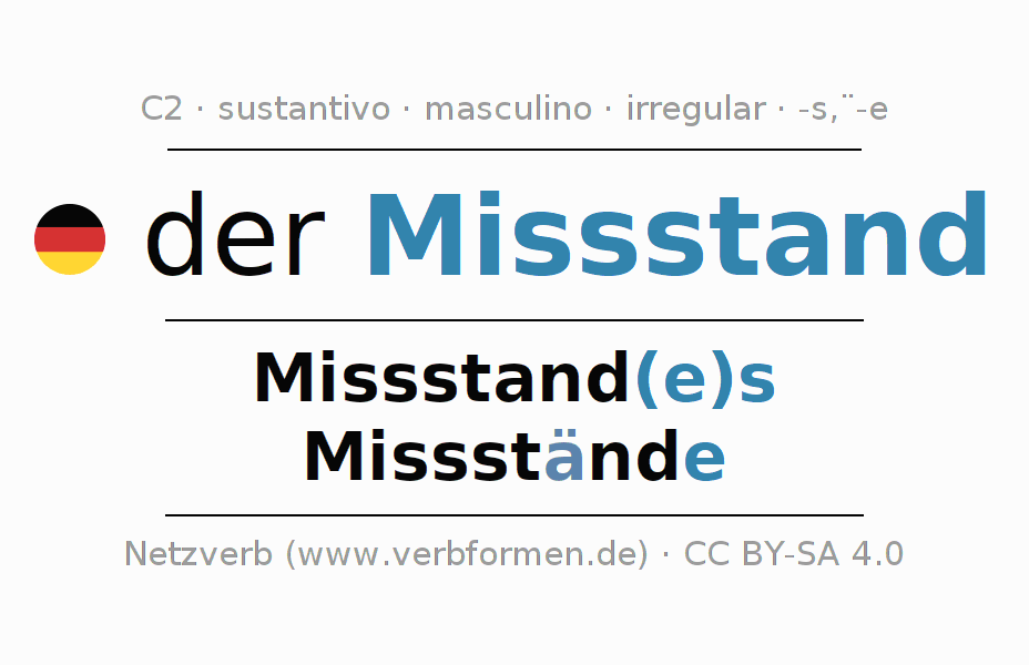 La declinación del sustantivoMissstand (defecto, desaguisado) se encuentra en genitivoMissstand(e)s del singular y en el nominativoMissstände del plural. El sustantivo Missstand se conjuga de forma fuerte (irregular) con estas terminaciones es/ä-e. El plural requiere el uso de diéresis. El género gramatical de Missstand es masculino y por eso se requiere el artículo definido ‘der’. Aquí puedes declinar no solamente Missstand sino también todos los sustantivos alemanes . Este sustantivo pertenece al vocabulario necesario para pasar el examen "Zertifikat Deutsch" o para el nivel C2. Comentarios ☆