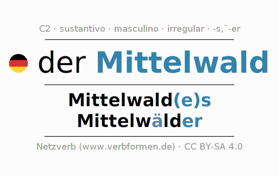 La declinación del sustantivo en forma de tabla con todas su formas: singular, plural y en los cuatro casos: nominativo (primer caso), genitivo (segundo caso), dativo (tercer caso) y acusativo (cuarto caso). Las construcciones gramaticales están representadas de forma clara en una tabla sinópica. La inflexión de los sustantivos es una ayuda durante tareas, exámenes, para cursos de alemán, la universidad, el estudio del alemán como lengua extranjera o como segundo idioma y para estudiantes adultos. La declinación correcta de las palabras es especialmente importante para los que aprenden el idioma alemán. Aquí encontraras más información acerca del tema Wiktionary Mittelwald y aquí también a través del Duden Mittelwald.