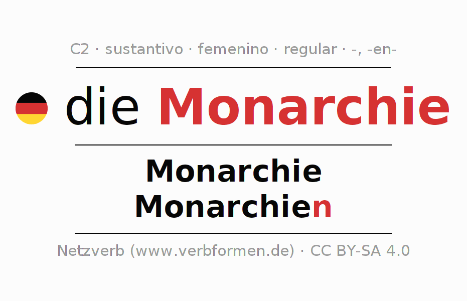 La declinación del sustantivo en forma de tabla con todas su formas: singular, plural y en los cuatro casos: nominativo (primer caso), genitivo (segundo caso), dativo (tercer caso) y acusativo (cuarto caso). Las construcciones gramaticales están representadas de forma clara en una tabla sinópica. La inflexión de los sustantivos es una ayuda durante tareas, exámenes, para cursos de alemán, la universidad, el estudio del alemán como lengua extranjera o como segundo idioma y para estudiantes adultos. La declinación correcta de las palabras es especialmente importante para los que aprenden el idioma alemán. Aquí encontraras más información acerca del tema Wiktionary Monarchie y aquí también a través del Duden Monarchie.