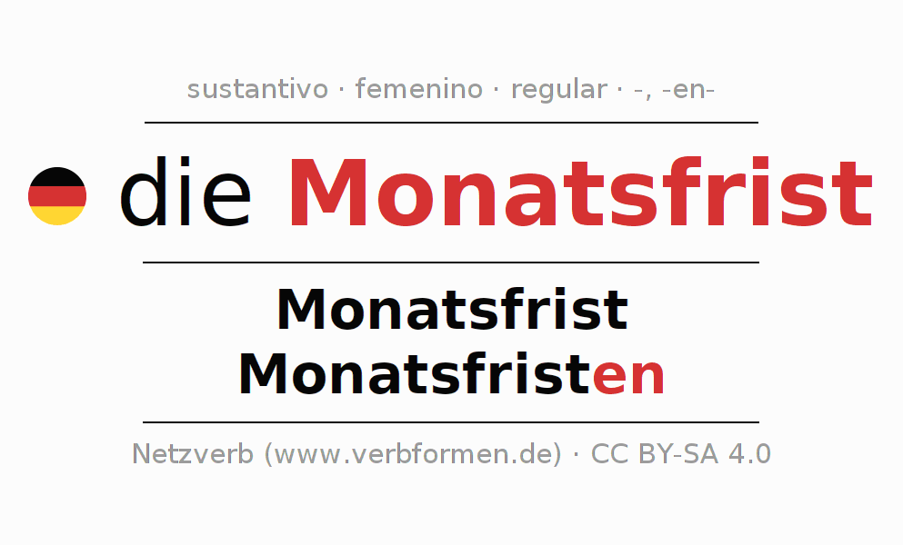 La declinación del sustantivo en forma de tabla con todas su formas: singular, plural y en los cuatro casos: nominativo (primer caso), genitivo (segundo caso), dativo (tercer caso) y acusativo (cuarto caso). Las construcciones gramaticales están representadas de forma clara en una tabla sinópica. La inflexión de los sustantivos es una ayuda durante tareas, exámenes, para cursos de alemán, la universidad, el estudio del alemán como lengua extranjera o como segundo idioma y para estudiantes adultos. La declinación correcta de las palabras es especialmente importante para los que aprenden el idioma alemán. Aquí encontraras más información acerca del tema Wiktionary Monatsfrist y aquí también a través del Duden Monatsfrist.
