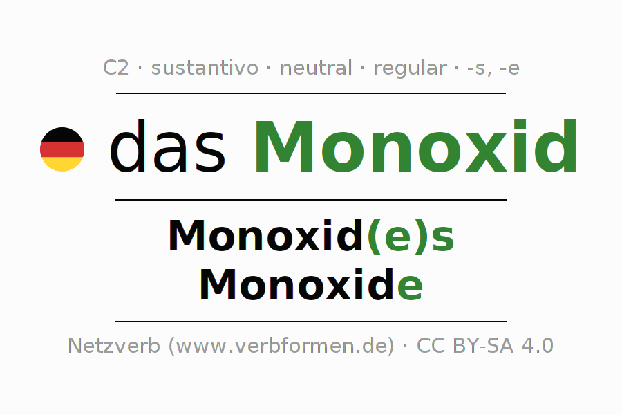 La declinación del sustantivo en forma de tabla con todas su formas: singular, plural y en los cuatro casos: nominativo (primer caso), genitivo (segundo caso), dativo (tercer caso) y acusativo (cuarto caso). Las construcciones gramaticales están representadas de forma clara en una tabla sinópica. La inflexión de los sustantivos es una ayuda durante tareas, exámenes, para cursos de alemán, la universidad, el estudio del alemán como lengua extranjera o como segundo idioma y para estudiantes adultos. La declinación correcta de las palabras es especialmente importante para los que aprenden el idioma alemán. Aquí encontraras más información acerca del tema Wiktionary Monoxid y aquí también a través del Duden Monoxid.