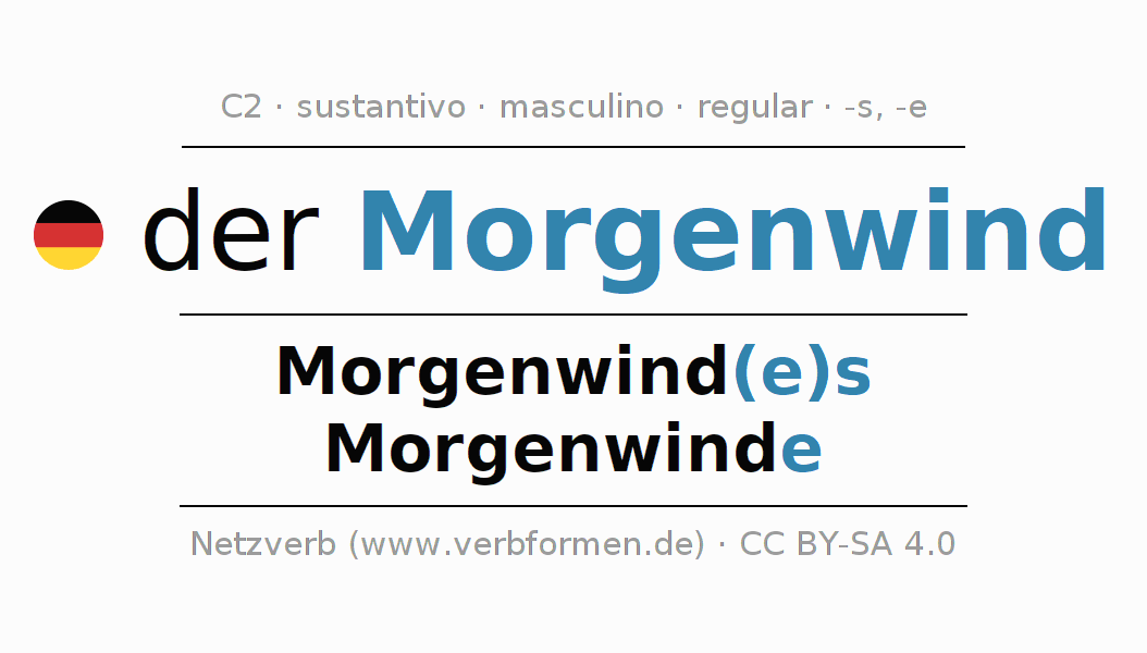 La declinación del sustantivo en forma de tabla con todas su formas: singular, plural y en los cuatro casos: nominativo (primer caso), genitivo (segundo caso), dativo (tercer caso) y acusativo (cuarto caso). Las construcciones gramaticales están representadas de forma clara en una tabla sinópica. La inflexión de los sustantivos es una ayuda durante tareas, exámenes, para cursos de alemán, la universidad, el estudio del alemán como lengua extranjera o como segundo idioma y para estudiantes adultos. La declinación correcta de las palabras es especialmente importante para los que aprenden el idioma alemán. Aquí encontraras más información acerca del tema Wiktionary Morgenwind y aquí también a través del Duden Morgenwind.