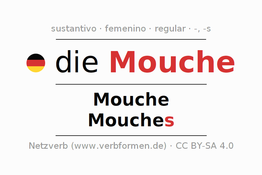 La declinación del sustantivoMouche (marca de belleza) se encuentra en genitivoMouche del singular y en el nominativoMouches del plural. El sustantivo Mouche se conjuga de forma fuerte (irregular) con estas terminaciones -/s. El género gramatical de Mouche es femenino y por eso se requiere el artículo definido ‘die’. Aquí puedes declinar no solamente Mouche sino también todos los sustantivos alemanes . Comentarios ☆