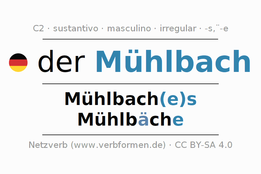 La declinación del sustantivo en forma de tabla con todas su formas: singular, plural y en los cuatro casos: nominativo (primer caso), genitivo (segundo caso), dativo (tercer caso) y acusativo (cuarto caso). Las construcciones gramaticales están representadas de forma clara en una tabla sinópica. La inflexión de los sustantivos es una ayuda durante tareas, exámenes, para cursos de alemán, la universidad, el estudio del alemán como lengua extranjera o como segundo idioma y para estudiantes adultos. La declinación correcta de las palabras es especialmente importante para los que aprenden el idioma alemán. Aquí encontraras más información acerca del tema Wiktionary Mühlbach y aquí también a través del Duden Mühlbach.