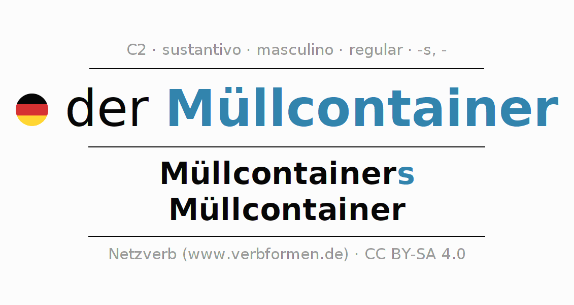 - Plural: die Müllcontainer, der Müllcontainer, den Müllcontainern, die Müllcontainer
