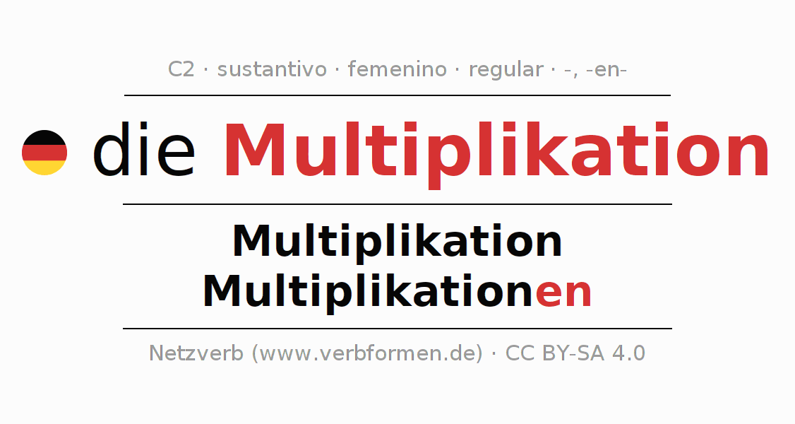La declinación del sustantivo en forma de tabla con todas su formas: singular, plural y en los cuatro casos: nominativo (primer caso), genitivo (segundo caso), dativo (tercer caso) y acusativo (cuarto caso). Las construcciones gramaticales están representadas de forma clara en una tabla sinópica. La inflexión de los sustantivos es una ayuda durante tareas, exámenes, para cursos de alemán, la universidad, el estudio del alemán como lengua extranjera o como segundo idioma y para estudiantes adultos. La declinación correcta de las palabras es especialmente importante para los que aprenden el idioma alemán. Aquí encontraras más información acerca del tema Wiktionary Multiplikation y aquí también a través del Duden Multiplikation.